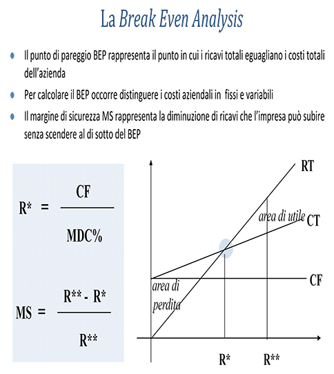 La Break Even Analysis è una tecnica utile in sede di controllo dei costi, alla quale si può ricorrere per la soluzione di problemi che riguardano la redditività dell’impresa. Permette di evidenziare l’andamento dei costi e dei ricavi in determinate ipotesi e di individuare il punto di equilibrio (Break Even Point), cioè il livello di produzione e vendita in corrispondenza del quale viene raggiunto il pareggio tra costi e ricavi. Il punto di equilibrio individua 2 aree: l’area di perdita, cioè i quantitativi di vendite (o fatturato) in corrispondenza dei quali i costi superano i ricavi, l’area di utile cioè quella che indica i quantitativi per cui i ricavi superano i costi. Il punto di equilibrio si ha quando si verifica l’uguaglianza RT=CT. La differenza tra prezzo e costo variabile unitario, esprime il contributo di ogni unità venduta alla copertura dei costi fissi e si chiama margine di contribuzione unitario.